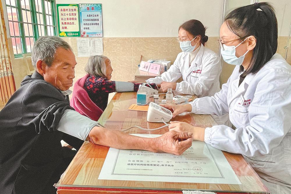 圖為縣醫院志愿者為村民測血壓。